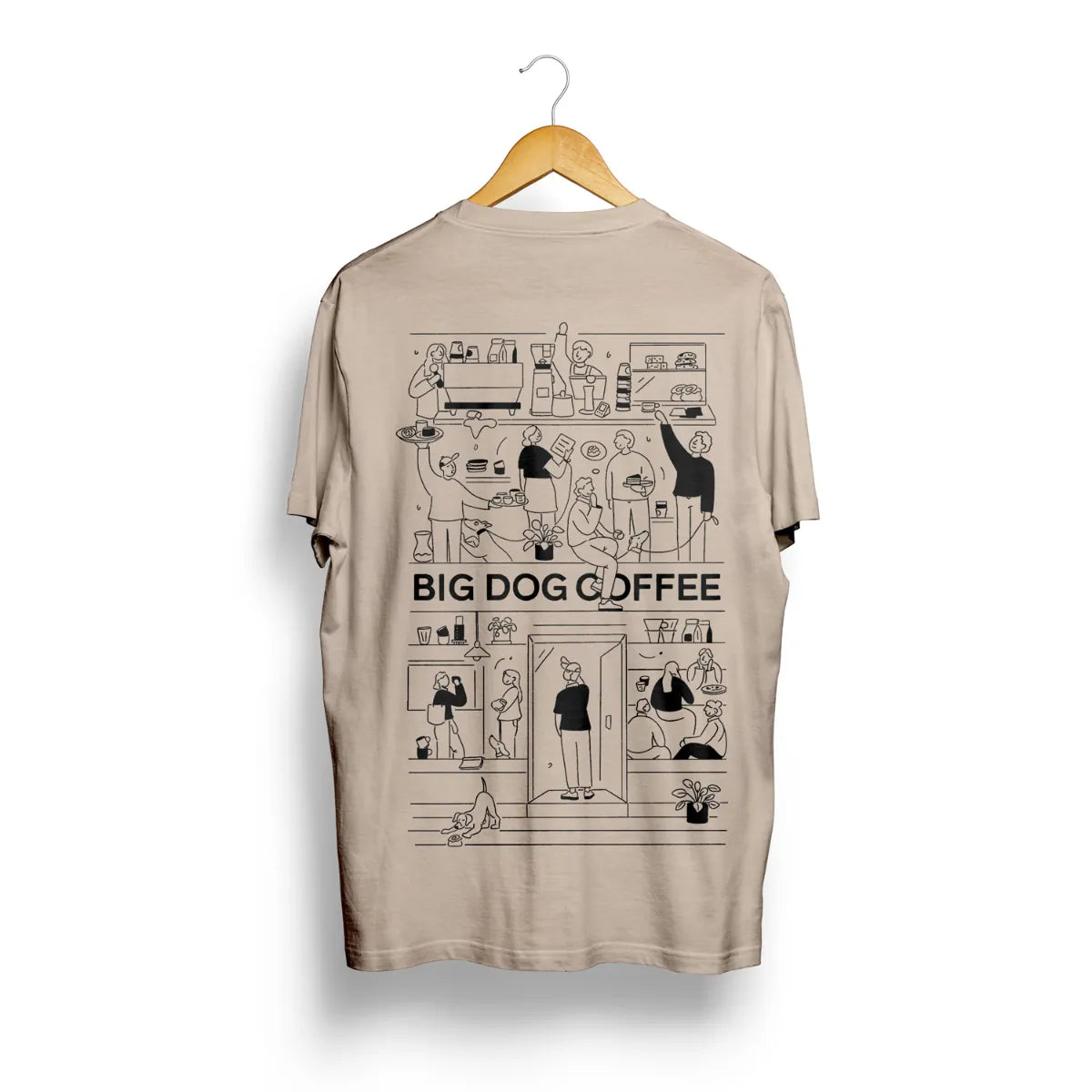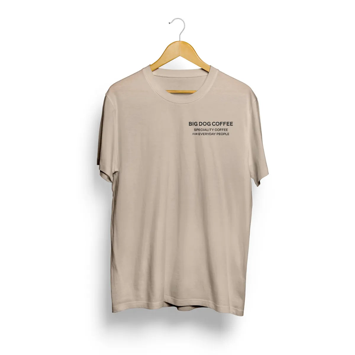 Beige t-shirt with 'BIG DOG COFFEE' text on a hanger against a white background